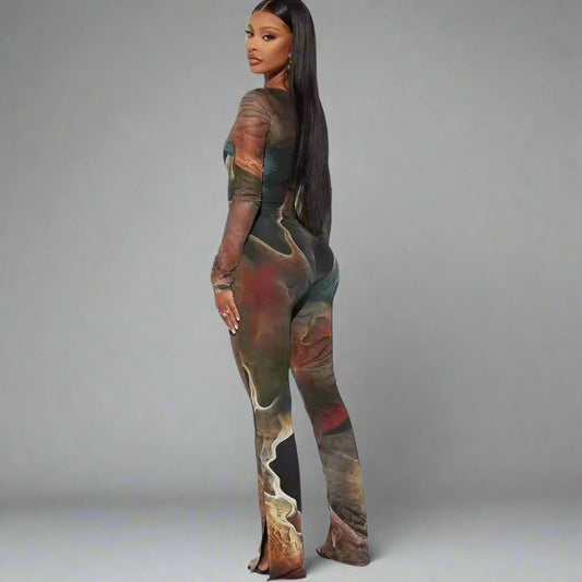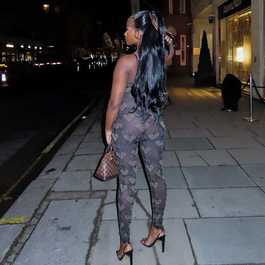 Sexy Mesh Floral Print Hollow Out Jumpsuit