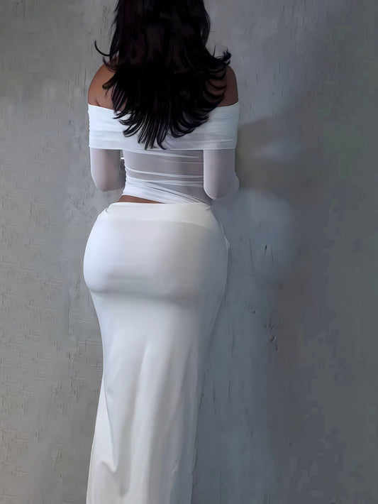 White Mesh Cutout Off-Shoulder Maxi Dress