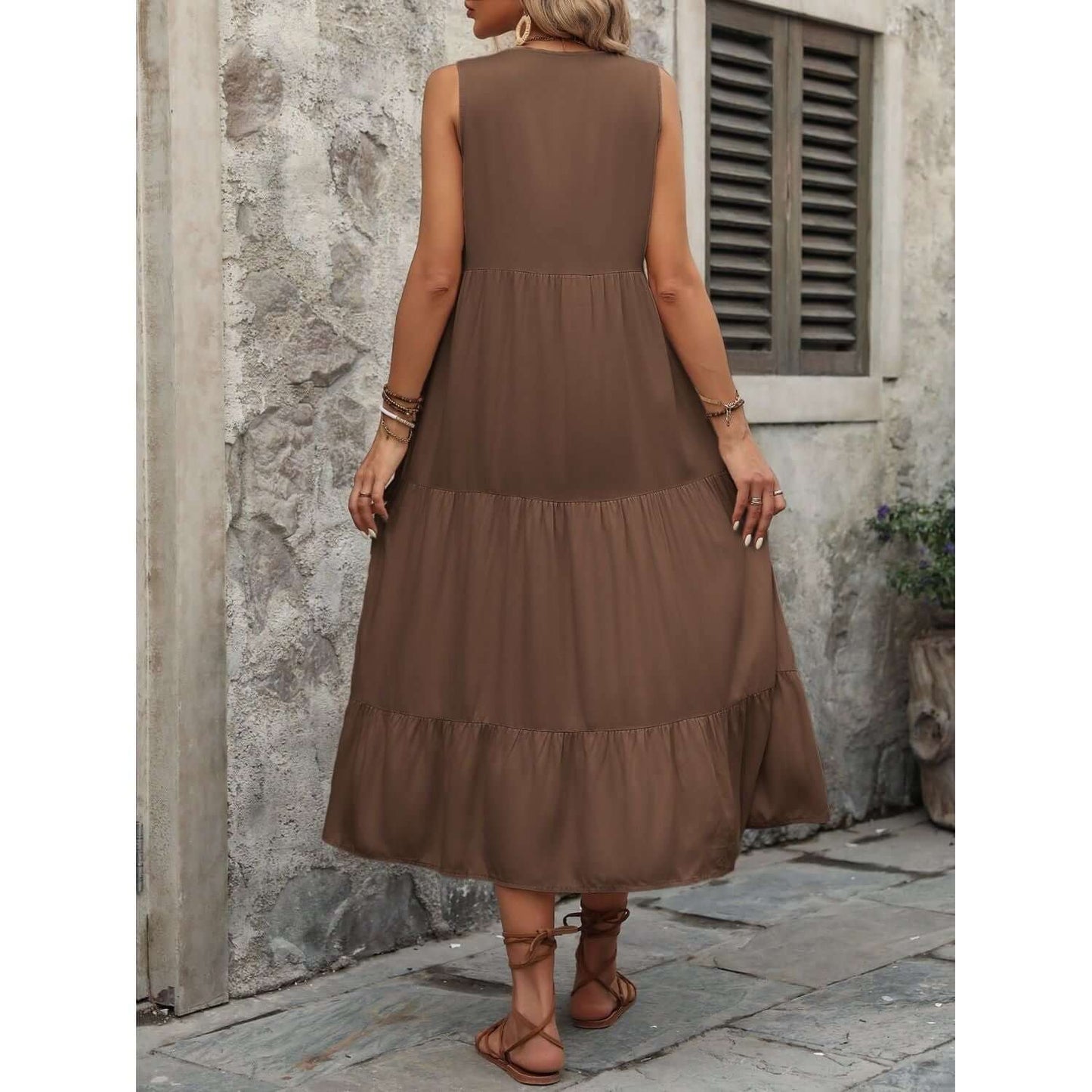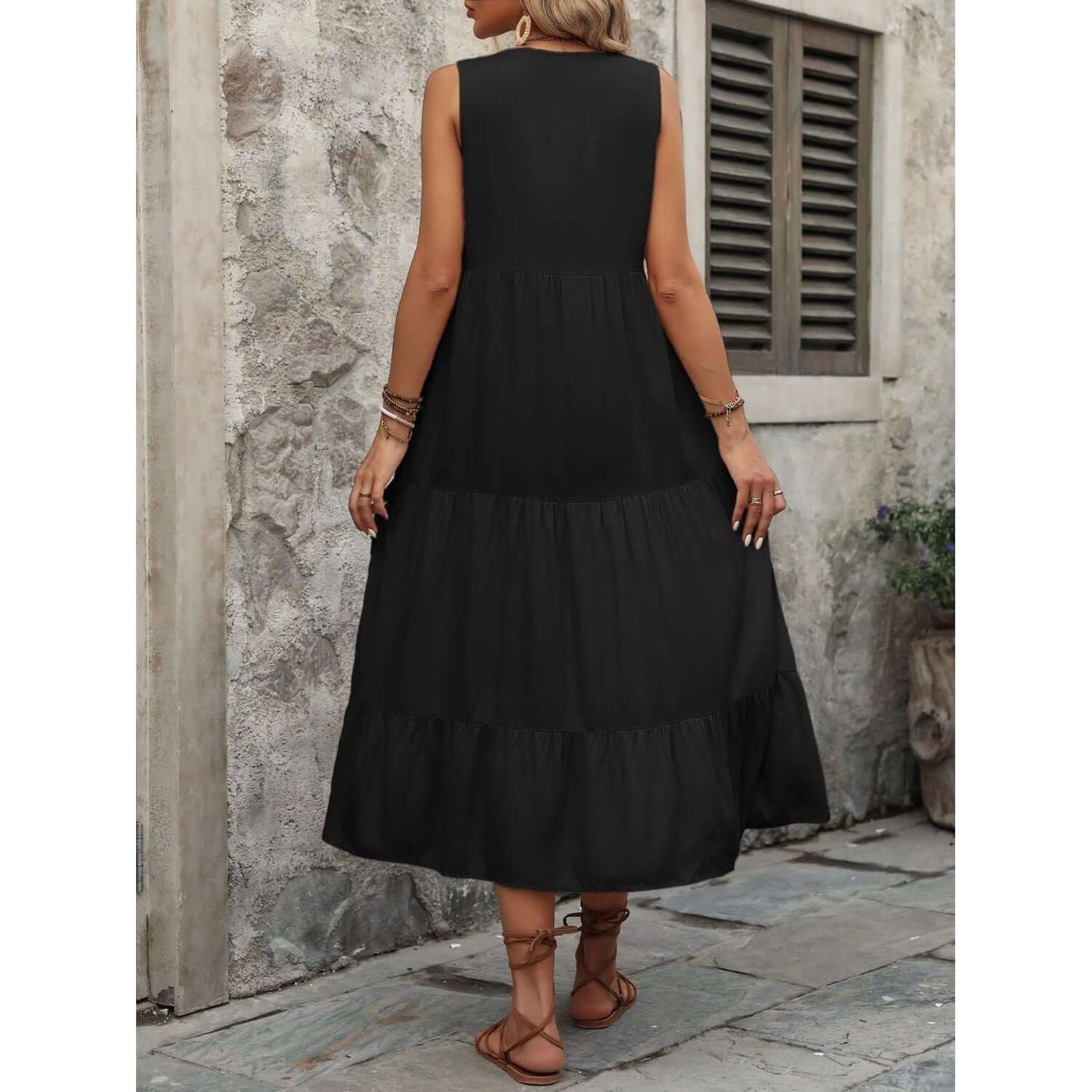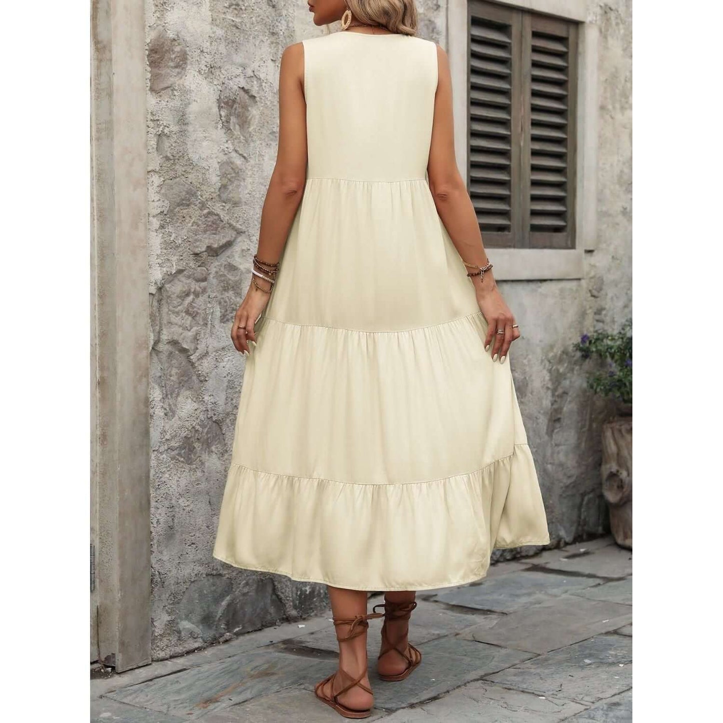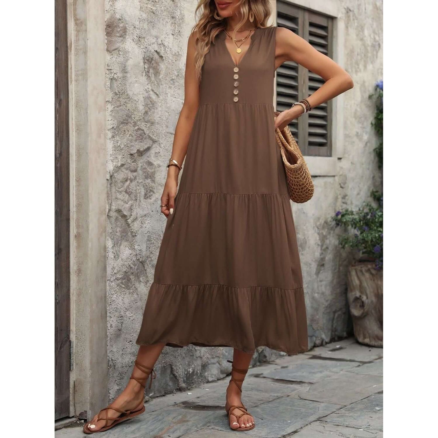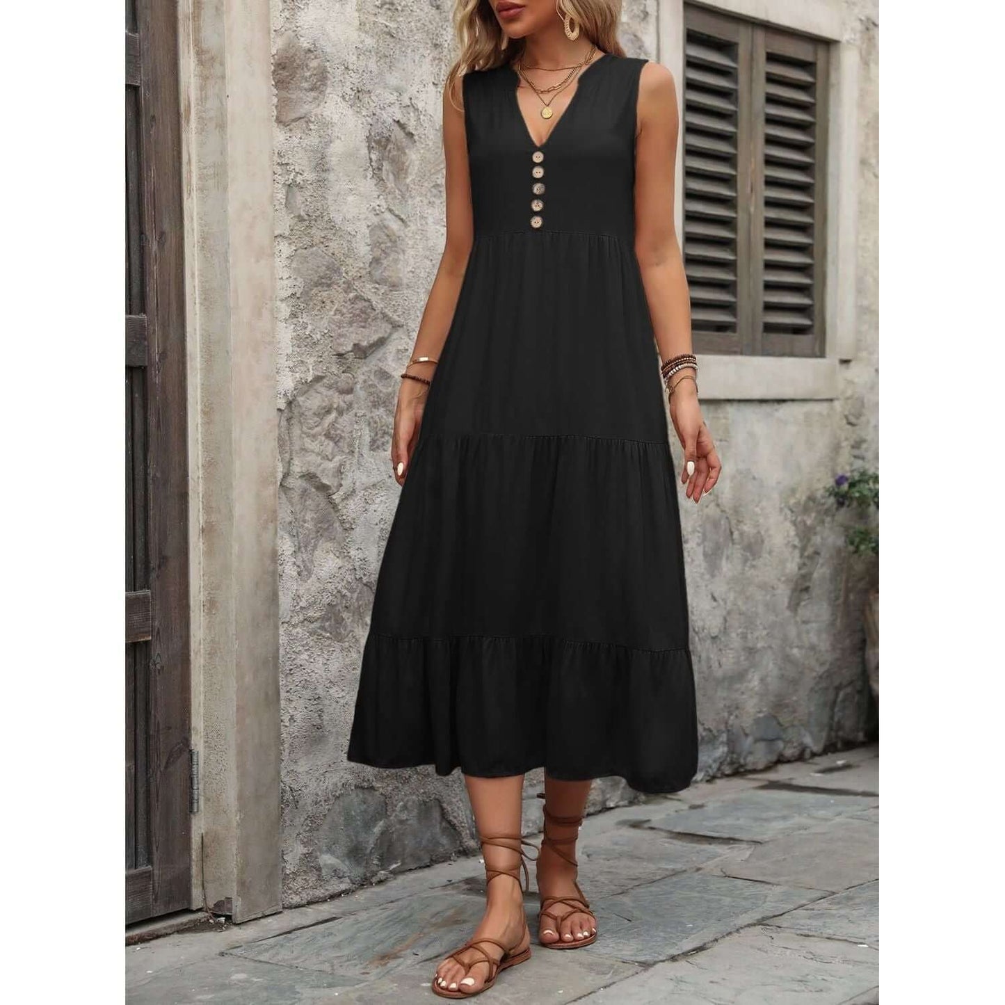 Elevate your style with our effortlessly chic decorative button-notched sleeveless dress. Crafted from 100% cotton, this dress boasts a comfortable fit with a hint of stretch, perfect for a day out or a casual evening. The opaque fabric ensures confidence and coverage, while the decorative button detailing adds a touch of sophistication. Easy to care for, this dress is machine washable and can be tumble dried on low. Imported with love, this dress is the perfect addition to your wardrobe.